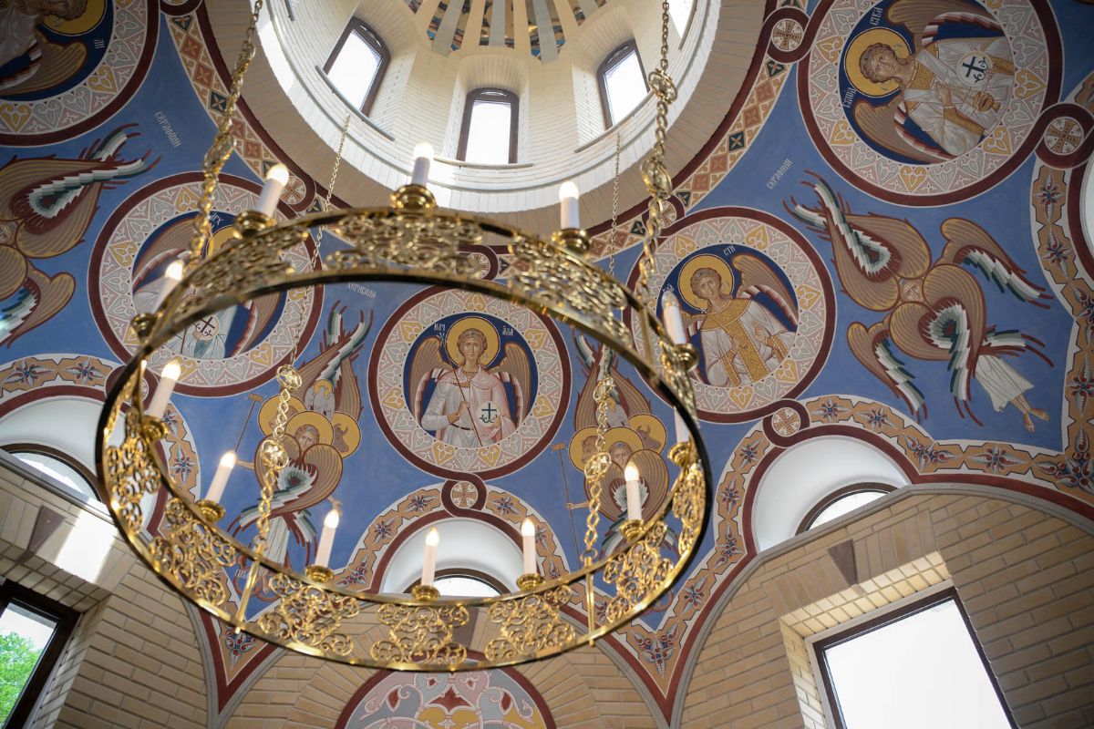 Необычна и интересна внутренняя архитектура храма: в перекрытии потолочного пространства открывается образ благословляющего нас Господа.