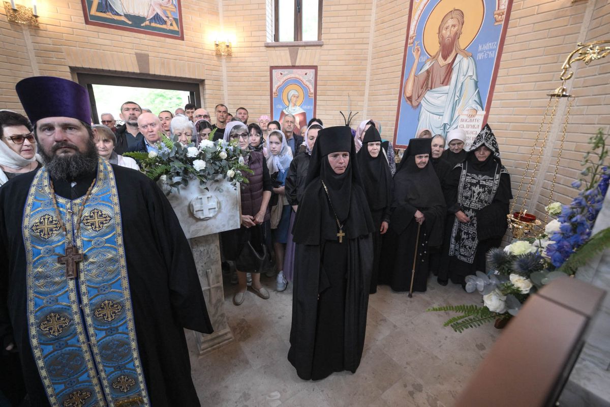 Первоначально храм предполагалось освятить в честь иконы Божией Матери «Игумения горы Афонской». В дальнейшем было принято решение посвятить этот храм небесному покровителю обители – великомученику Георгию Победоносцу.